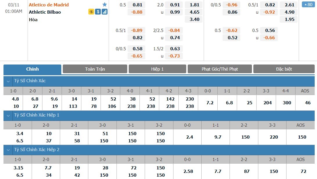 Atletico Madrid chắc chắn vẫn sẽ là cửa trên ở trận này và họ sẽ có một tỷ lệ cược không cao. Ngược lại những kết quả Athletic Bilbao thắng và kết quả hòa sẽ có những tỷ lệ cược hấp dẫn hơn. Phong độ của Atletico Madrid đang có dấu hiệu sa sút. Phải đón tiếp một Athletic Bilbao rất khó chịu, khả năng Atletico Madrid sảy chân là không hề thấp. Đây là kèo đấu mà người chơi có thể mạo hiểm với ô cược hòa.