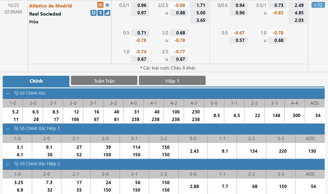 Atletico Madrid vẫn sẽ được đánh giá cao hơn Real Sociedad rất nhiều ở kèo này. Tỷ lệ cược của Atletico Madrid chỉ là 1 ăn 1.71 trong khi đó Real Sociedad có tỷ lệ cược lên tới 1 ăn 5.00. Tỷ số hòa có tỷ lệ cược là 1 ăn 3.65. Đây là lúc mà Real Sociedad vẫn đang thi đấu khá tốt và có cơ sở để mạo hiểm với ô cược hòa ở trận này.