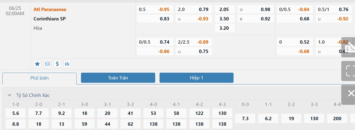 Dự đoán kèo tỷ số hiệp 1: Atletico Paranaense 1-0 Corinthians