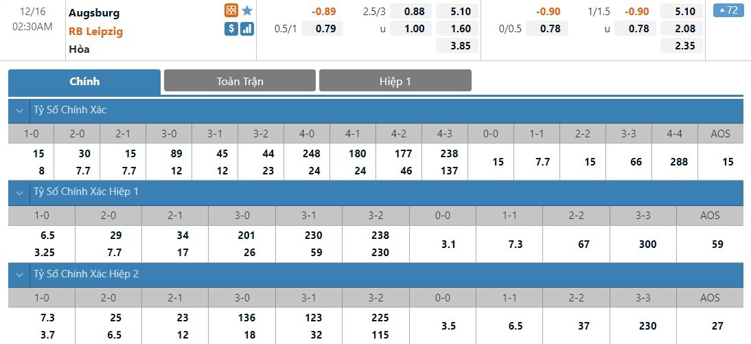 RB Leipzig vẫn sẽ được đánh giá cao hơn Augsburg rất nhiều ở kèo đấu này. Tỷ lệ cược của RB Leipzig chỉ là 1 ăn 1.60 trong khi đó Augsburg có tỷ lệ cược lên tới 1 ăn 5.10. Tỷ số hòa có tỷ lệ cược là 1 ăn 3.85. Augsburg lúc này không được đánh giá cao và đây sẽ là một đối thủ rất vừa sức cho RB Leipzig. Đội khách được dự đoán vẫn sẽ có được một chiến thắng ở trận này.