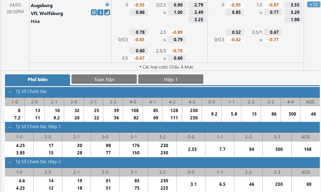 Kèo châu Á toàn trận: Augsburg +1/4 (FT)