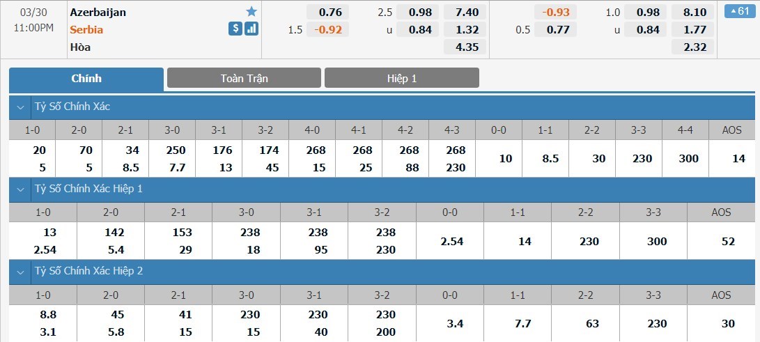 Soi kèo tài xỉu, kèo tỷ số Azerbaijan vs Serbia