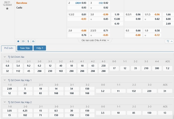 Dự đoán kèo tỷ số hiệp 1: Barcelona 1-0 Cadiz
