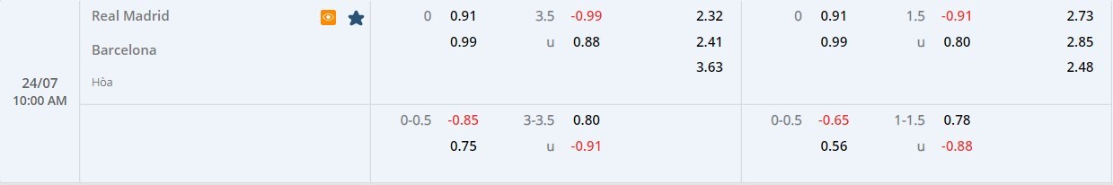 Tỷ lệ cược của Barcelona và Real Madrid ở kèo đấu này sẽ gần như không có sự chênh lệch. Hai đội sẽ có những tỷ lệ cược rất cân bằng ở trận này. Ở loạt trận giao hữu đầu mùa này, Barcelona là cái tên đang cho thấy quyết tâm. Với những tân binh đáng chú ý của mình, Barcelona cũng đã cho thấy những tín hiệu khởi sắc. Với quyết tâm lấn át kình địch Real Madrid, có thể Barcelona sẽ làm nên chuyện ở trận giao hữu này với một chiến thắng.