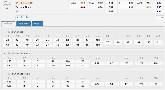 BATE Borisov vẫn được nhà cái đánh giá nhỉnh hơn với mốc tỷ lệ chấp -1/4 trái. Song nhìn vào định mức lợi nhuận dành cho 2 ô cược thì có thể thấy sự chênh lệch giữa hai đội là không đáng kể. Partizani hoàn toàn có đủ sức để tạo ra phiền toái cho BATE Borisov trong màn tái đấu sắp tới. Không loại trừ khả năng hai đội sẽ lại tiếp tục bất phân thắng bại sau thời gian thi đấu chính thức của trận đấu lượt về.