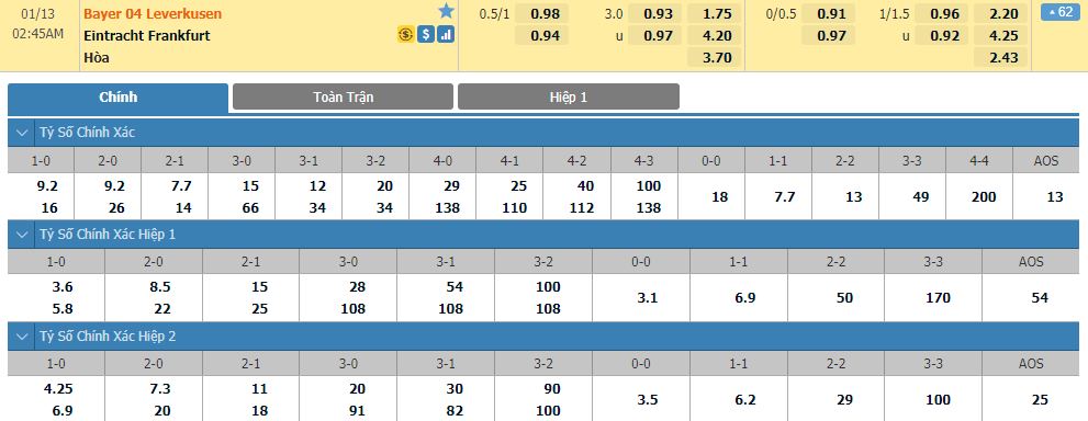 Dự đoán kèo tỷ số hiệp 1: Bayer Leverkusen 2-1 Eintracht Frankfurt
