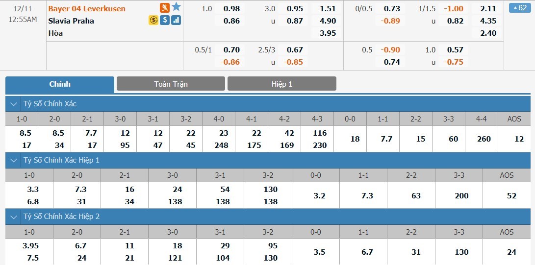 Với lợi thế sân nhà, Bayer Leverkusen được đánh giá cao hơn Slavia Praha khá nhiều ở kèo đấu này. Đội chủ nhà có tỷ lệ cược 1 ăn 1.51 trong khi đội khách có tỷ lệ lên tới 1 ăn 4.90. Tỷ số hòa có tỷ lệ cược là 1 ăn 3.95. Phong độ của Slavia Praha đang là rất cao và nên nhớ rằng ở trận lượt đi họ từng đánh bại Leverkusen. Với kèo đấu này, ô cược hòa sẽ là lựa chọn hợp lý.