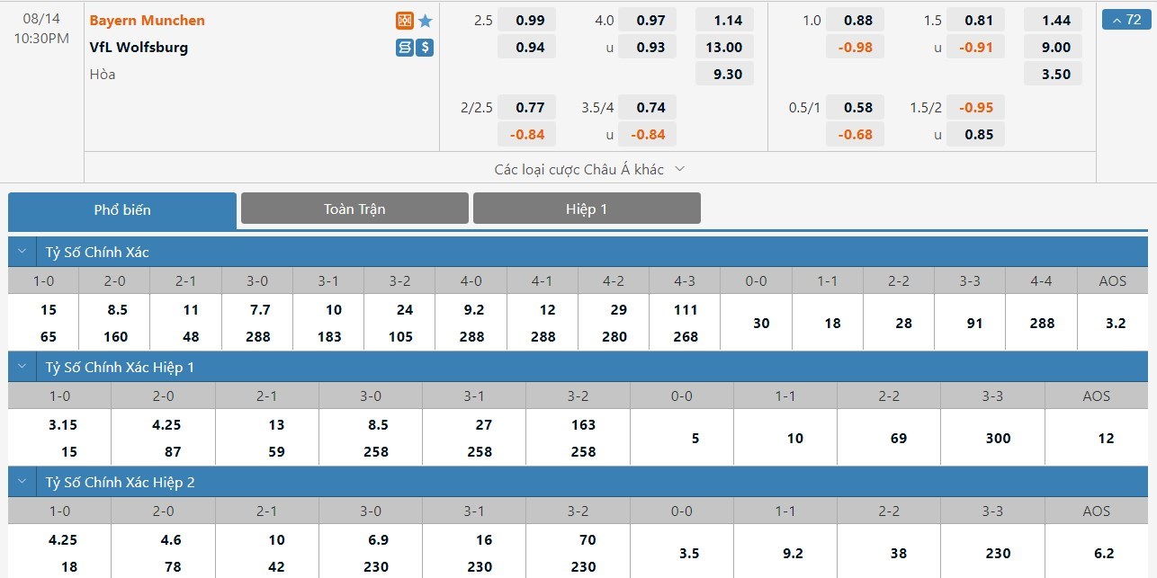 Trong 3 trận gần nhất của mình, có tới 2 trận Wolfsburg giữ được sạch lưới. Với lối chơi phòng ngự số đông, Wolfsburg có thể sẽ tạo ra được không ít khó khăn cho Bayern Munich ở trận này và đây là trận đấu mà đội chủ nhà sẽ ghi không quá nhiều bàn. Tỷ lệ tài xỉu cho kèo đấu này lên tới 4 trái và với tỷ lệ cao như vậy, ô cược xỉu sẽ là lựa chọn hợp lý hơn.