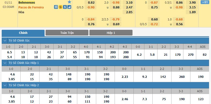Dự đoán kèo tỷ số hiệp 1: Belenenses 0-1 Ferreira