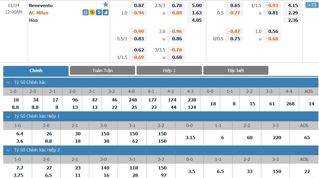 AC Milan được đánh giá cao hơn Benevento khá nhiều ở trận này dù họ phải thi đấu trên sân khách. Tỷ lệ cược của Milan chỉ là 1 ăn 1.63 trong khi Benevento có tỷ lệ cược lên tới 1 ăn 5.00. Tỷ số hòa có tỷ lệ cược là 1 ăn 4.05. Benevento thi đấu khó chịu ở mùa giải năm nay và họ cũng đang có phong độ rất cao. Trong khi đó Milan lại đang thi đấu không quá thuyết phục và chuyến làm khách này sẽ ẩn chứa khá nhiều rủi ro với họ.