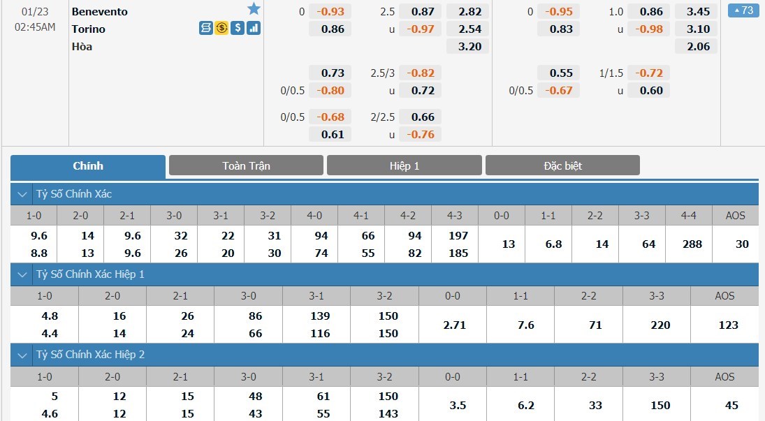 Tỷ lệ cược của 2 đội bóng ở kèo đấu này khá cân bằng nhau. Torino được đánh giá cao hơn đôi chút với tỷ lệ 1 ăn 2.54 trong khi Benevento có tỷ lệ cược là 1 ăn 2.82. Tỷ số hòa có tỷ lệ cược là 1 ăn 3.20. Torino vẫn đang thể hiện một phong độ rất tệ ở mùa giải năm nay. Trong khi đó Benevento đang cho thấy những dấu hiệu tích cực trong lối chơi. Với lợi thế sân nhà, Benevento được dự đoán sẽ có 3 điểm ở trận này.