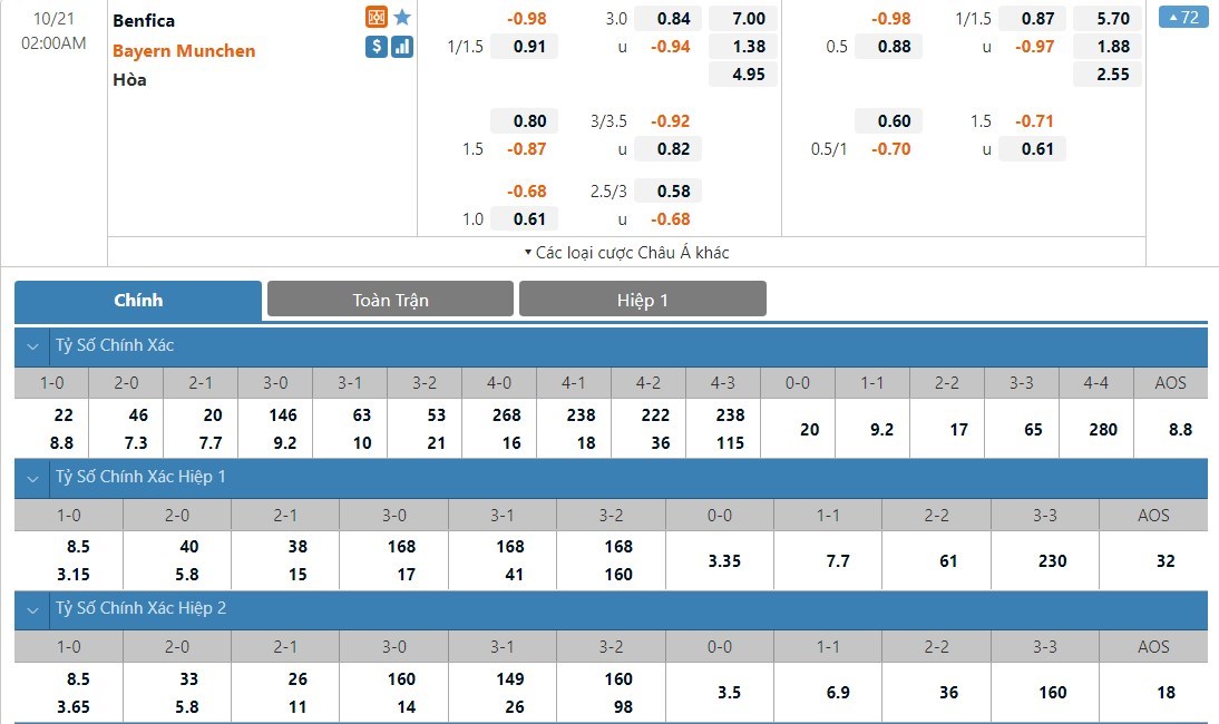 Bayern Munich vẫn sẽ được đánh giá cao hơn Benfica khá nhiều ở kèo đấu này. Tỷ lệ cược của Bayern Munich chỉ là 1 ăn 1.38 trong khi đó Benfica có tỷ lệ cược lên tới 1 ăn 7.00. Tỷ số hòa có tỷ lệ cược là 1 ăn 4.95. Bayern Munich vẫn đang cho thấy một phong độ cực kì ấn tượng và so với Benfica họ vẫn đang tỏ ra vượt trội. Chiến thắng cho đội khách sẽ là kết quả ở kèo đấu này.
