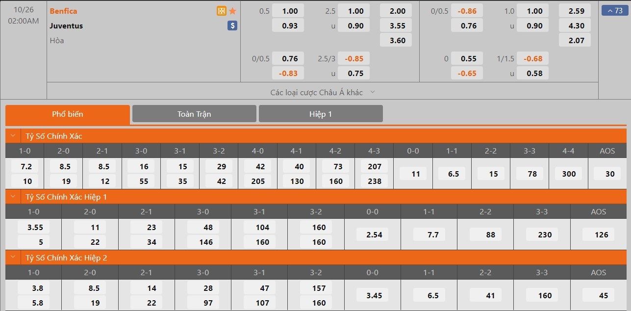 Tỷ lệ cược của Benfica và Juventus ở kèo đấu này không chênh nhau quá nhiều. Kết quả Benfica thắng trận có tỷ lệ cược là 1 ăn 2.00 trong khi đó kết quả Juventus thắng trận có tỷ lệ cược là 1 ăn 3.55. Tỷ số hòa có tỷ lệ cược là 1 ăn 3.60. Juventus đang có dấu hiệu hồi sinh. Sở hữu một lực lượng mạnh, Juventus vẫn sẽ là cái tên đáng gờm nếu họ chơi đúng sức. Ở kèo đấu này, Juventus được dự đoán vẫn sẽ có được 1 điểm.