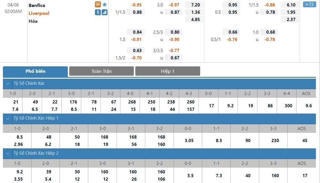 Phải làm khách nhưng Liverpool vẫn được đánh giá cao hơn Benfica rất nhiều ở trận này. Tỷ lệ cược của Liverpool chỉ là 1 ăn 1.36 trong khi đó Benfica có tỷ lệ cược lên tới 1 ăn 7.20. Tỷ số hòa có tỷ lệ cược là 1 ăn 4.85. Liverpool vẫn sẽ là một thử thách quá lớn giành cho Benfica và đội chủ nhà vẫn sẽ khó để tạo ra được quá nhiều những bất ngờ ở trận này.