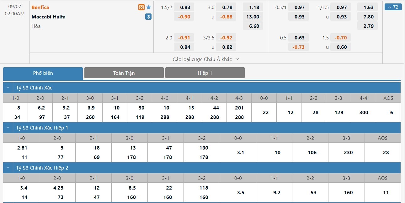 Soi kèo tài xỉu, kèo tỷ số Benfica vs Maccabi Haifa