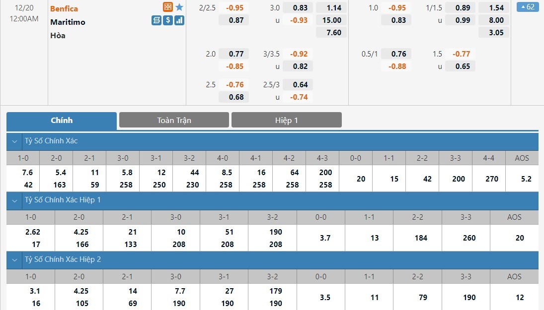 Tỷ lệ cược của Benfica và Maritimo ở kèo đấu này có sự chênh lệch rất lớn. Benfica chỉ có tỷ lệ cược là 1 ăn 1.14 trong khi đó Maritimo có tỷ lệ cược lên tới 1 ăn 15.00. Tỷ số hòa có tỷ lệ cược là 1 ăn 7.60. Benfica lúc này vẫn vượt trội hoàn toàn so với Maritimo và đội chủ nhà vẫn sẽ có được một chiến thắng.
