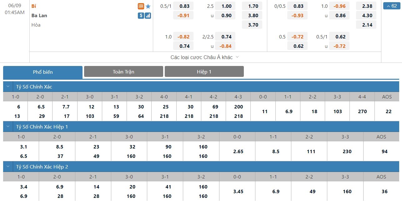 Bỉ vẫn sẽ được đánh giá cao hơn Ba Lan không ít ở trận này. Kết quả Bỉ thắng trận chỉ có tỷ lệ cược là 1 ăn 1.70 trong khi đó kết quả Ba Lan thắng trận có tỷ lệ cược là 1 ăn 3.80. Tỷ số hòa có tỷ lệ cược là 1 ăn 3.70. Bỉ đang tỏ ra khá rệu rã và phong độ của họ đang là rất tệ. Trong khi đó Ba Lan vẫn đang cho thấy họ là một tập thể khó chịu và đội khách có thể sẽ tạo ra bất ngờ để có được 1 điểm ở trận này.