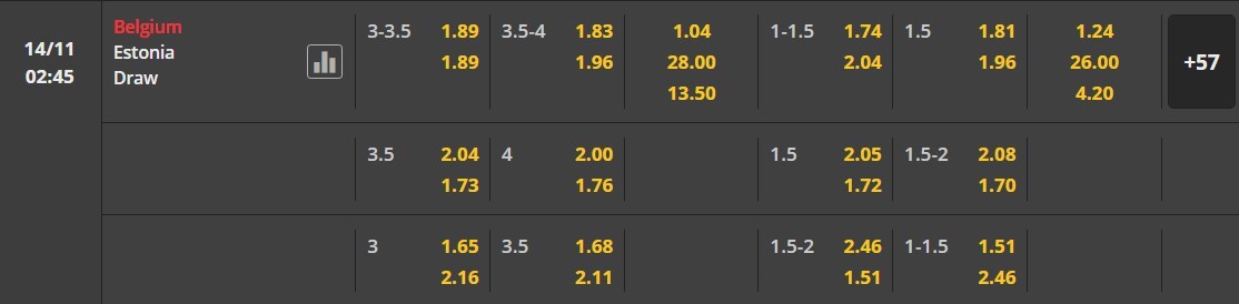 Tỷ lệ cược của Bỉ và Estonia ở kèo đấu này sẽ có sự chênh lệch cực kì lớn. Bỉ sẽ được đánh giá cao hơn Estonia rất nhiều ở kèo này. Những kết quả Estonia có điểm sẽ có tỷ lệ cược rất hấp dẫn tuy nhiên viễn cảnh này sẽ khó có thể xảy ra khi mà Bỉ vẫn đang tỏ ra quá vượt trội so với Estonia. Ở kèo đấu này, cửa trên Bỉ vẫn sẽ là lựa chọn hợp lý hơn