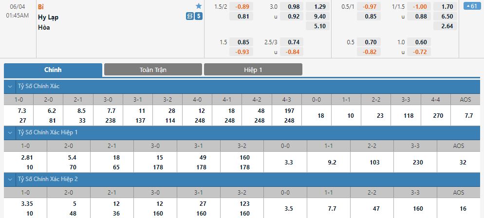 Kèo châu Á toàn trận: Bỉ -1 3/4 (FT)