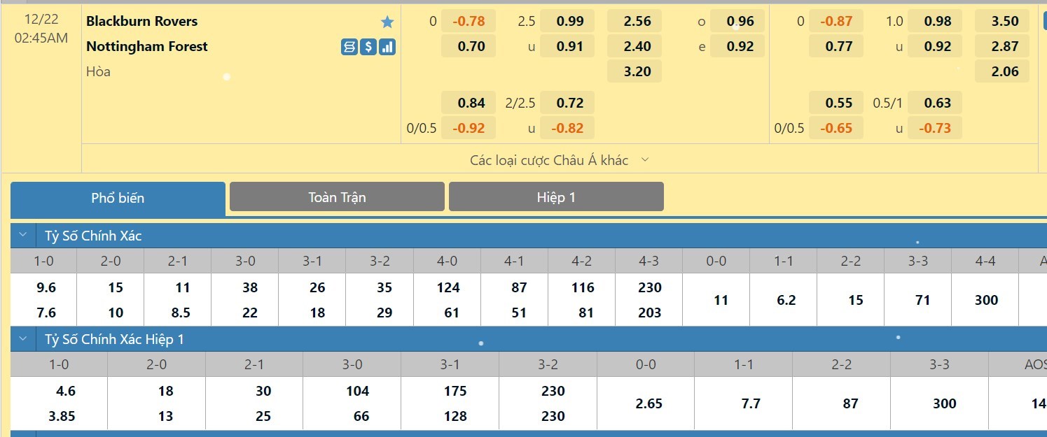 Dự đoán kèo tỷ số hiệp 1: Blackburn 0-1 Nottingham
