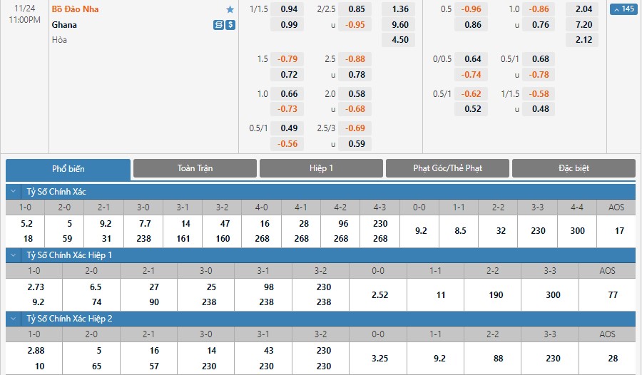 Tỷ lệ cược của Bồ Đào Nha và Ghana ở kèo đấu này có sự chênh lệch rất lớn. Kết quả Bồ Đào Nha thắng trận chỉ có tỷ lệ cược là 1 ăn 1.36. Ngược lại những kết quả Ghana thắng và hòa lần lượt có tỷ lệ cược lên tới 1 ăn 9.60 và 1 ăn 4.50. Bồ Đào Nha xét về đẳng cấp lẫn trình độ đều đang vượt trội hơn Ghana nhiều. Cán cân sức mạnh đang quá nghiêng về Bồ Đào Nha và đại diện của châu Âu sẽ có được một chiến thắng.