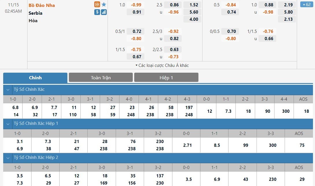 Bồ Đào Nha với lợi thế sân nhà sẽ được đánh giá cao hơn Serbia rất nhiều ở kèo đấu này theo tỷ lệ cược. Dù vậy Serbia không phải cái tên dễ chơi lúc này. Phong độ của Serbia cũng đang là khá tốt và có thể mạo hiểm với ô cược hòa ở kèo đấu này.