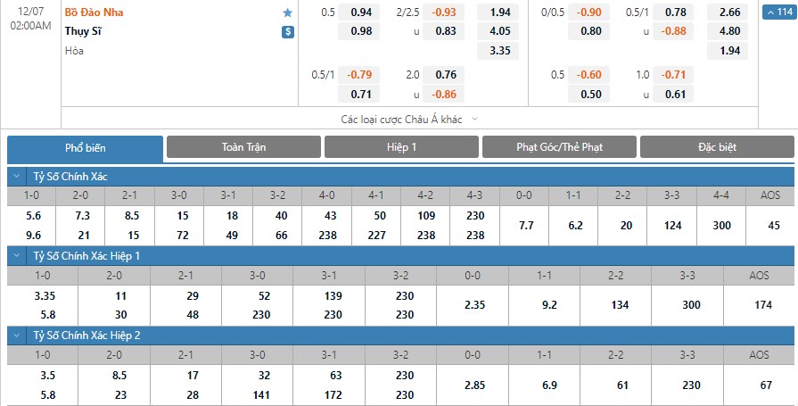 Dự đoán kèo tỷ số hiệp 1: Bồ Đào Nha 1-0 Thụy Sĩ