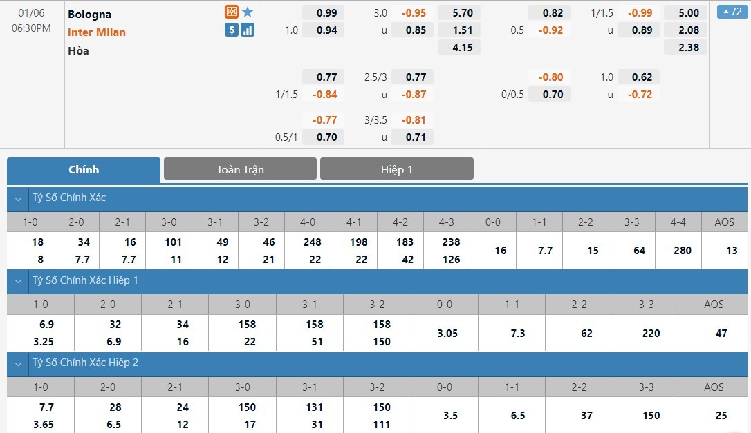 Dự đoán kèo tỷ số hiệp 1: Bologna 0-2 Inter Milan