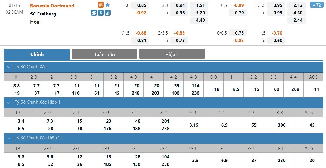 Dortmund sẽ được đánh giá cao hơn Freiburg khá nhiều ở kèo đấu này. Tỷ lệ cược của Dortmund chỉ là 1 ăn 1.51 trong khi đó Freiburg có tỷ lệ cược là 1 ăn 5.20. Tỷ số hòa có tỷ lệ cược là 1 ăn 4.40. Freiburg đang có dấu hiệu sa sút phong độ. Làm khách trước một Dortmund có trình độ tốt, họ nhiều khả năng sẽ phải nhận thêm một thất bại.