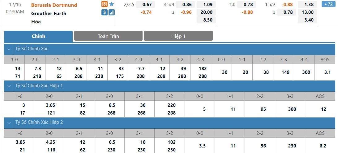 Kèo châu Á toàn trận: Borussia Dortmund -2 1/4 (FT)