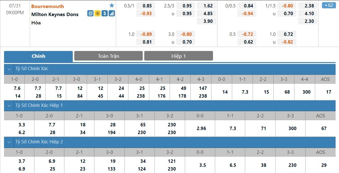Tỷ lệ cược của Bournemouth và MK Dons ở kèo đấu này sẽ có sự chênh lệch rất lớn. Bournemouth sẽ có tỷ lệ cược thấp hơn MK Dons đáng kể khi mà họ sẽ được đánh giá cao hơn đối thủ rất nhiều. MK Dons là một đối thủ vừa sức với Bournemouth và đội chủ nhà sẽ có chiến thắng ở trận này