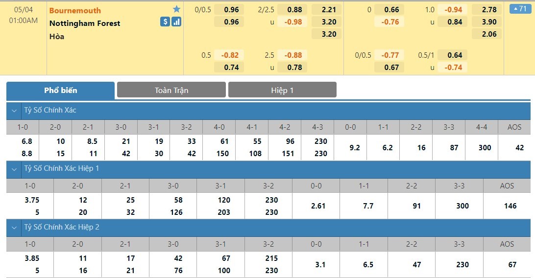 Nhà cái đã đưa ra tỷ lệ kèo cho trận này ở mức -1/4 trái dành cho Bournemouth bởi ưu thế được chơi trên sân nhà. Tuy nhiên, nếu xét trên thực tế thì Nottingham Forest mới đang là những người có phong độ thi đấu tốt hơn trong quãng thời gian gần đây. Còn nhìn vào lịch sử đối đầu thì thành tích của 2 đội đang rất cân bằng. Ở 8 lần gần nhất Bournemouth chạm trán với Nottingham, mỗi bên đều đã có cho mình 3 chiến thắng, cùng với đó là 2 trận có kết quả hòa.