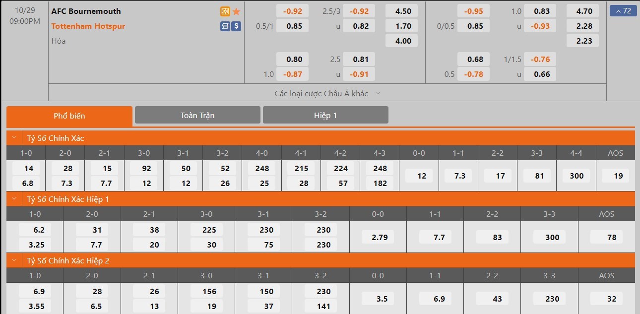 Tottenham vẫn sẽ được đánh giá cao hơn Bournemouth khá nhiều ở kèo đấu này. Kết quả Bournemouth thắng trận có tỷ lệ cược là 1 ăn 4.50 trong khi đó kết quả Tottenham thắng trận có tỷ lệ cược chỉ là 1 ăn 1.70. Tỷ số hòa có tỷ lệ cược là 1 ăn 4.00. Bournemouth sau chuỗi trận chơi khởi sắc đang trở lại với một bộ mặt nghèo nàn. Đón tiếp một đối thủ mạnh như Tottenham, Bournemouth sẽ khó tạo ra được bất ngờ và cửa trên Tottenham sẽ là lựa chọn cho kèo đấu này.