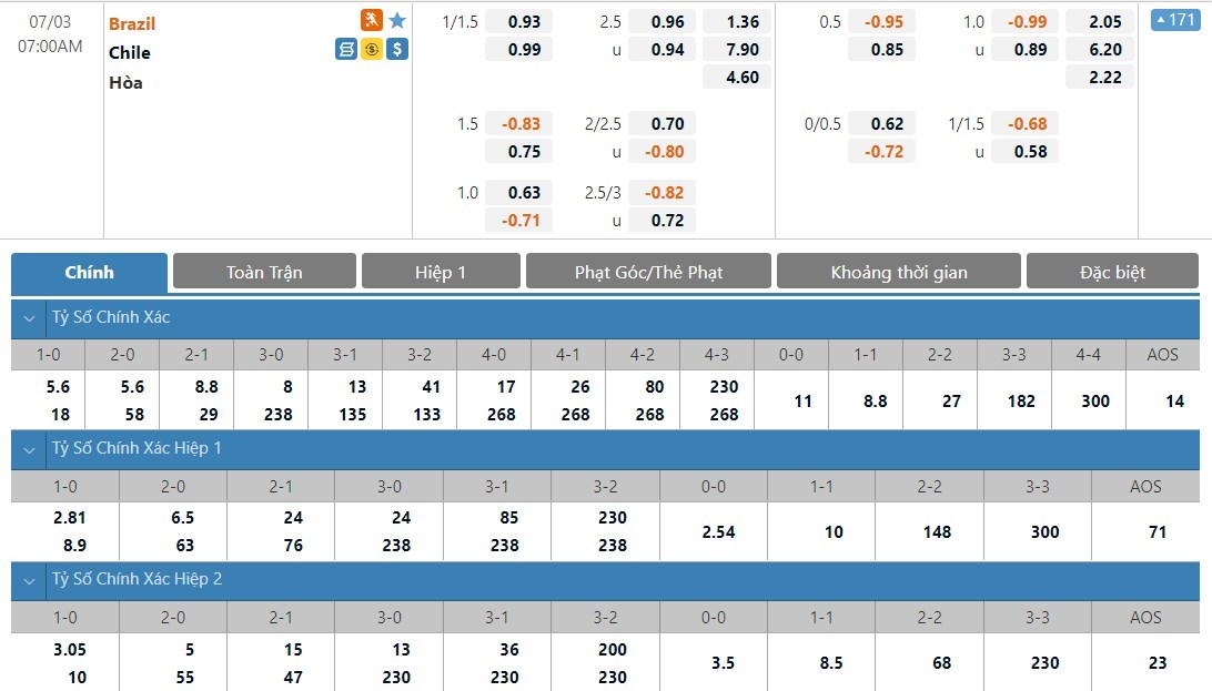 Soi kèo tài xỉu, kèo tỷ số Brazil vs Chile
