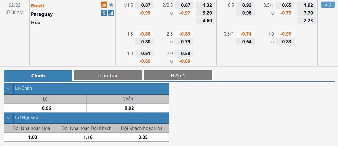 Brazil sẽ được đánh giá cao hơn Paraguay rất nhiều ở kèo đấu này. Tỷ lệ cược của Brazil là 1 ăn 1.32 trong khi đó Paraguay có tỷ lệ cược lên tới 1 ăn 9.20. Tỷ số hòa có tỷ lệ cược là 1 ăn 4.60. Paraguay đang có phong độ rất nghèo nàn. Làm khách trước một Brazil quá mạnh, họ sẽ khó tránh được một thất bại ở trận này.