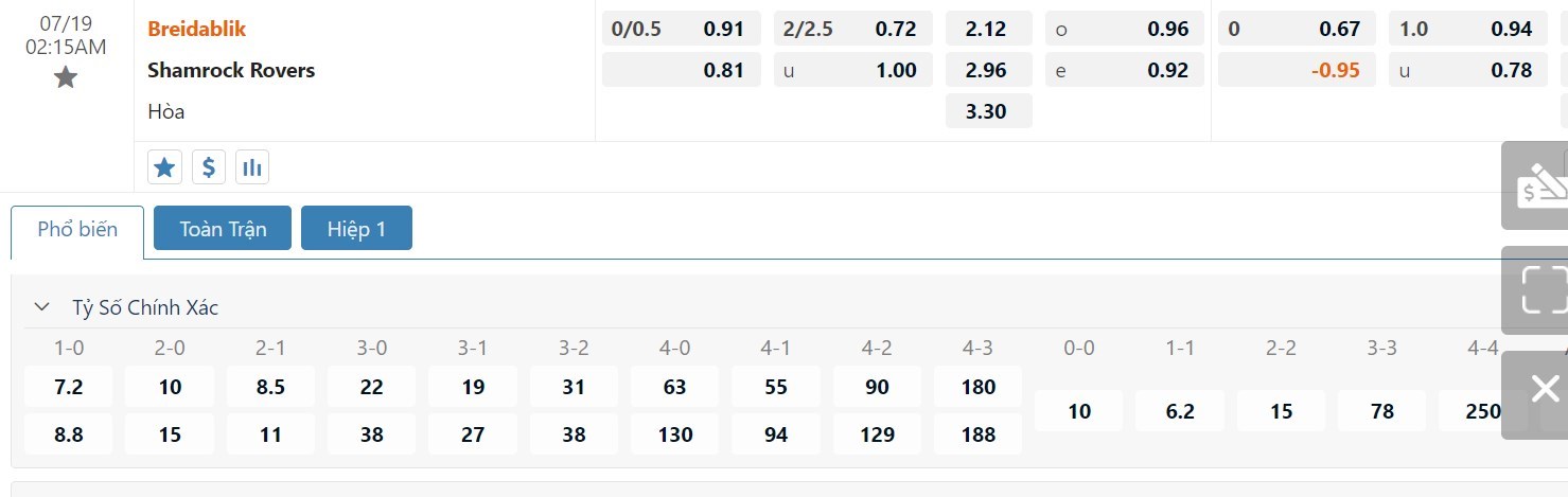 Dự đoán kèo tỷ số hiệp 1: Breidablik 2-1 Shamrock Rovers