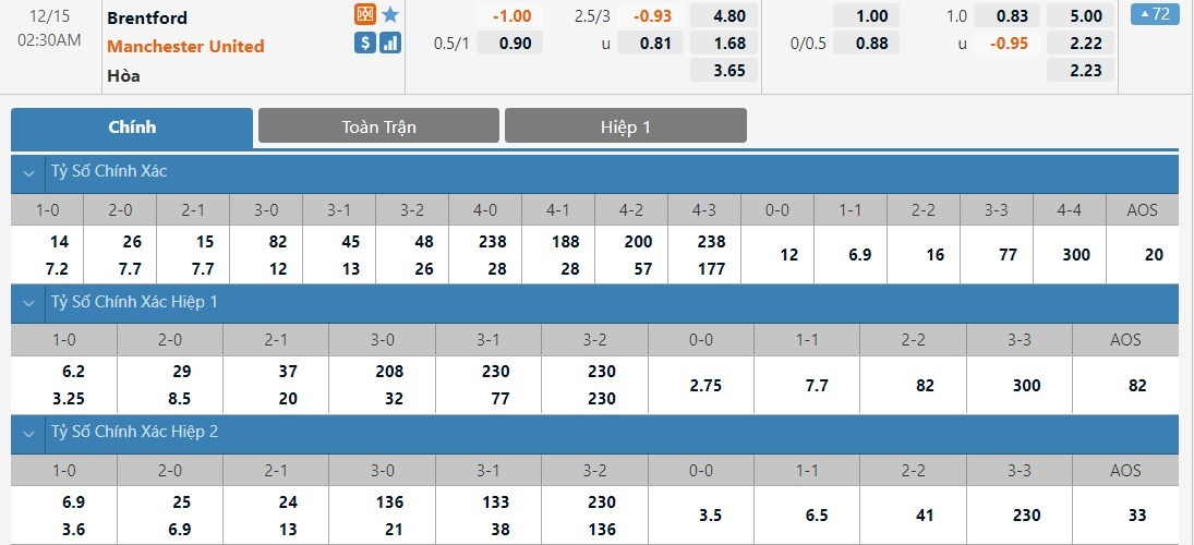 Dự đoán kèo tỷ số hiệp 1: Brentford 0-2 Manchester United