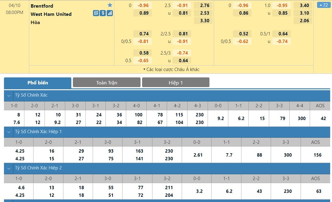 Soi kèo tài xỉu, kèo tỷ số Brentford vs West Ham