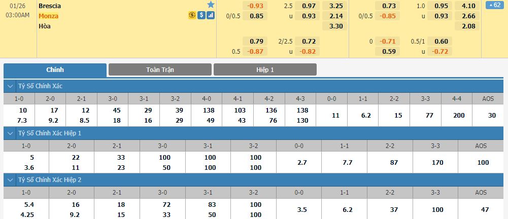 Dự đoán kèo tỷ số hiệp 1: Brescia 0-2 Monza