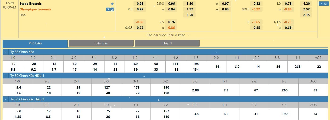 Xu hướng cho thấy Brest chỉ thắng 3 trong số 18 trận gần đây nhất của họ. Họ chỉ có được 1 chiến thắng trong 9 trận gần nhất tại Ligue 1 trên sân nhà và có tối đa 2 bàn thắng được ghi ở 4 trong 7 trận sân nhà gần nhất. Tỷ lệ kèo được đưa ra ở cuộc đối đầu này là -1/2 trái nghiêng về Lyon và điều này là không có gì phải bàn cãi quá nhiều. Ở 5 lần gần nhất hai đội bóng này chạm trán nhau trực tiếp thì Lyon là đội bóng thể hiện ấn tượng hơn với việc có 2 thắng lợi và chỉ để thua 1 trận. Vì lẽ đó, các nhà đầu tư nên tin tưởng lựa chọn đội khách ở trận đấu này.