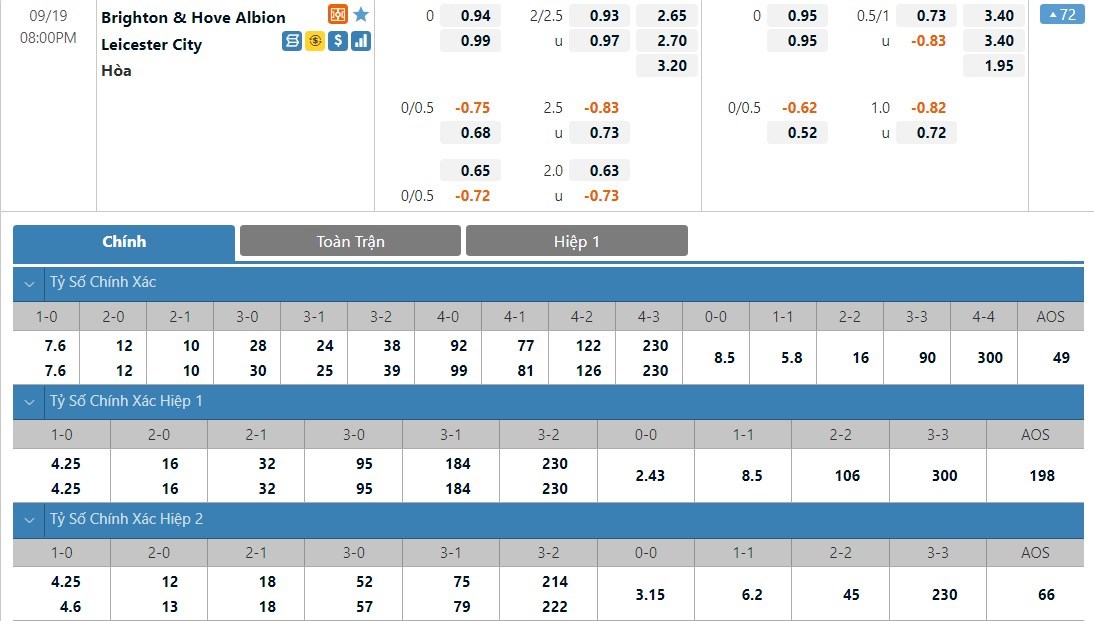 Brighton sẽ được đánh giá cao hơn đôi chút so với Leicester ở trận này khi họ có lợi thế sân nhà. Tỷ lệ cược của Brighton là 1 ăn 2.65 trong khi đó Leicester có tỷ lệ cược là 1 ăn 2.70. Tỷ số hòa có tỷ lệ cược là 1 ăn 3.20. Leicester không phải cái tên dễ chơi và với đẳng cấp của mình, đội khách được dự đoán vẫn sẽ có được một tỷ số hòa ở trận này.