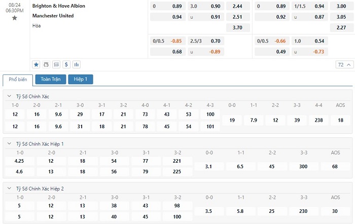 Soi kèo tài xỉu, kèo tỷ số Brighton vs Manchester United