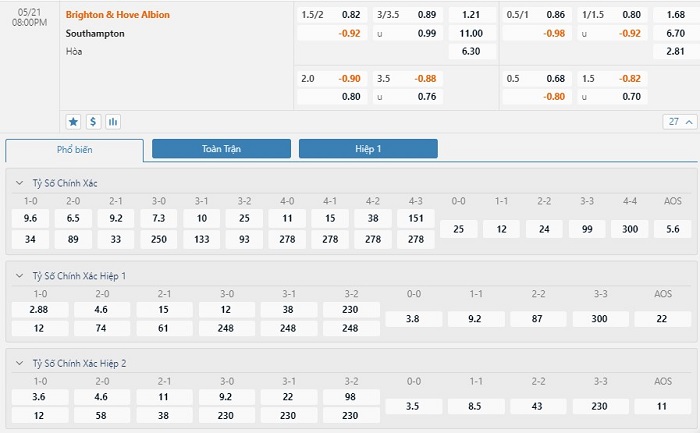 Trong 5 trận đấu gần nhất của mình, Brighton đã có 2 trận đấu mang về được cho mình ít nhất là 1 bàn thắng trong hiệp đấu đầu tiên. Còn với Southampton, đội bóng này đã có 3 lần làm được điều này trong 45 phút đầu tiên. Với tỷ lệ kèo hiệp 1 là Brighton chấp -3/4 trái thì các nhà đầu tư nên tin tưởng vào đội chủ nhà ở trong hiệp đấu đầu tiên này.