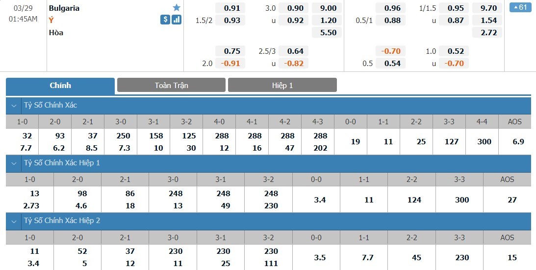 Soi kèo tài xỉu, kèo tỷ số Bulgaria vs Italia