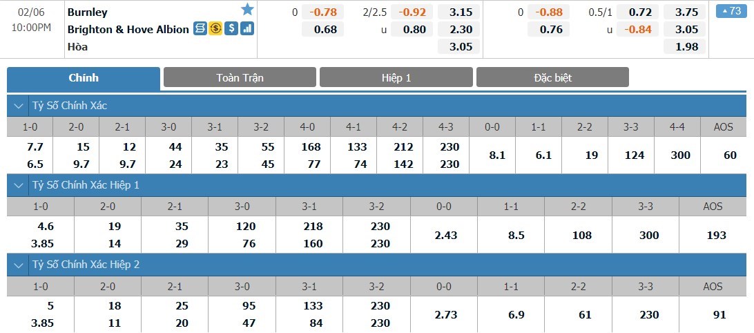 Brighton được đánh giá cao hơn Burnley đôi chút ở trận này dù họ là đội khách. Tỷ lệ cược của Brighton là 1 ăn 2.30 trong khi đó Burnley có tỷ lệ cược là 1 ăn 3.15. Tỷ số hòa có tỷ lệ cược là 1 ăn 3.05. Đây là giai đoạn mà Burnley đang có phong độ khá cao. Có lợi thế sân nhà và cũng chỉ phải đón tiếp một đối thủ vừa sức, Burnley hoàn toàn có khả năng giành trọn 3 điểm ở trận này. Mạo hiểm đôi chút với cửa cược Burnley sẽ là một lựa chọn không quá tệ.