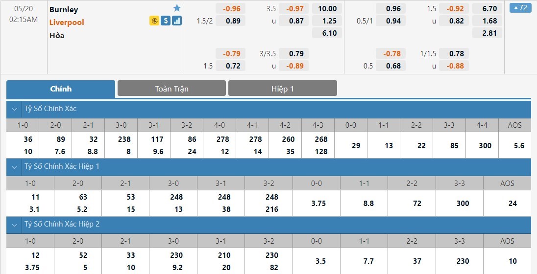 Tỷ lệ cược của Burnley và Liverpool ở kèo đấu này có sự chênh lệch rất lớn. Burnley có tỷ lệ cược lên tới 1 ăn 10.00 trong khi đó Liverpool chỉ có tỷ lệ cược là 1 ăn 1.25. Tỷ số hòa có tỷ lệ cược là 1 ăn 6.10. Burnley lúc này đã hết động lực thi đấu trong khi đó Liverpool buộc phải thắng nếu muốn có hi vọng chen chân vào top 4. Trước một đối thủ khá dễ chịu, Liverpool được dự đoán sẽ có 3 điểm ở trận này.