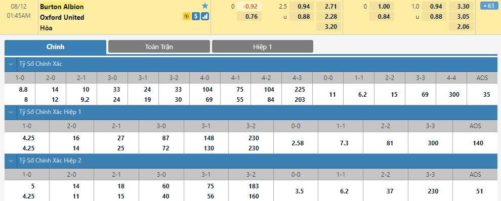 Dự đoán kèo tỷ số hiệp 1: Burton Albion 0-2 Oxford United