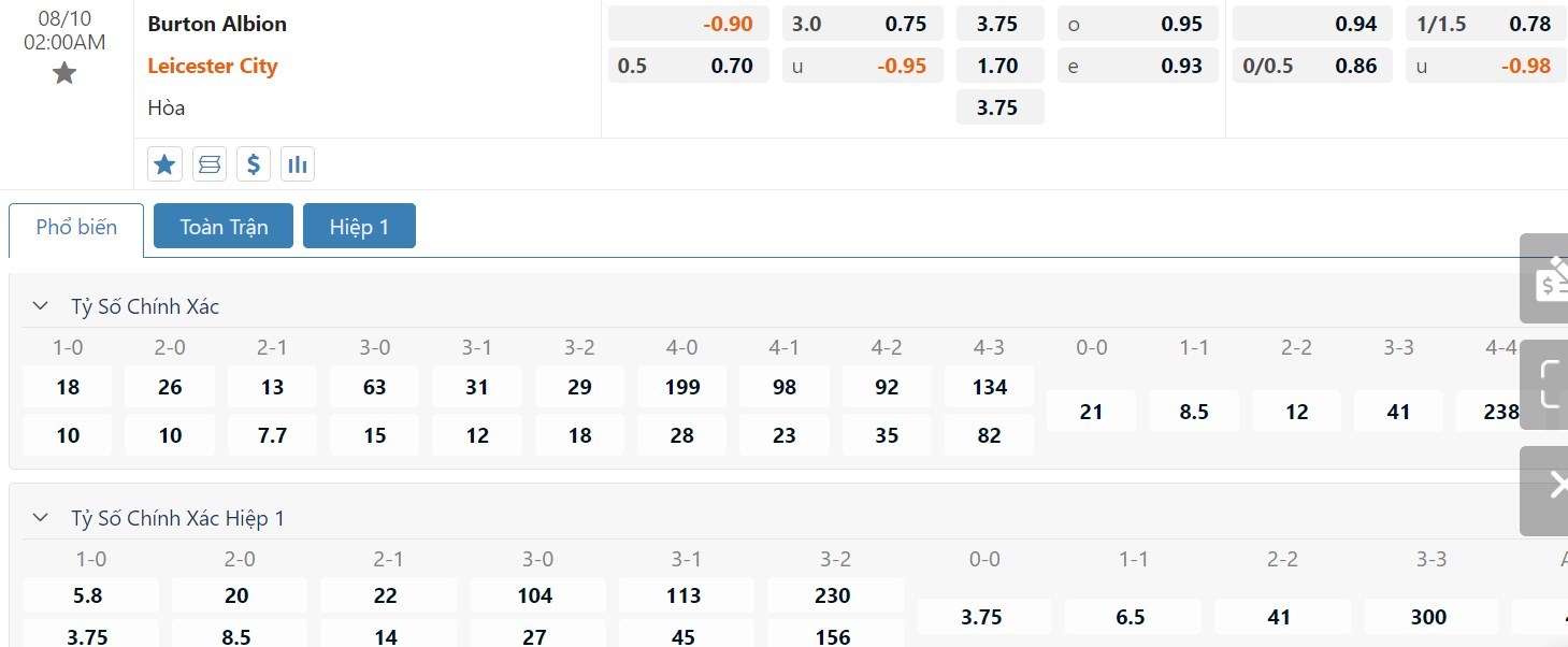 Soi kèo tài xỉu, kèo tỷ số Burton vs Leicester