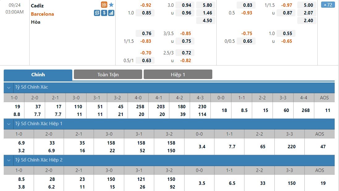 Barcelona vẫn sẽ được đánh giá cao hơn Cadiz rất nhiều ở kèo đấu này. Tỷ lệ cược của Barcelona chỉ là 1 ăn 1.46 trong khi đó Cadiz có tỷ lệ cược lên tới 1 ăn 5.80. Tỷ số hòa có tỷ lệ cược là 1 ăn 4.50. Cadiz đang thi đấu không quá ấn tượng và đây vẫn được đánh giá là một đối thủ vừa sức cho Barcelona. Ở kèo đấu này, cửa trên Barcelona vẫn sẽ là lựa chọn được đánh giá cao.
