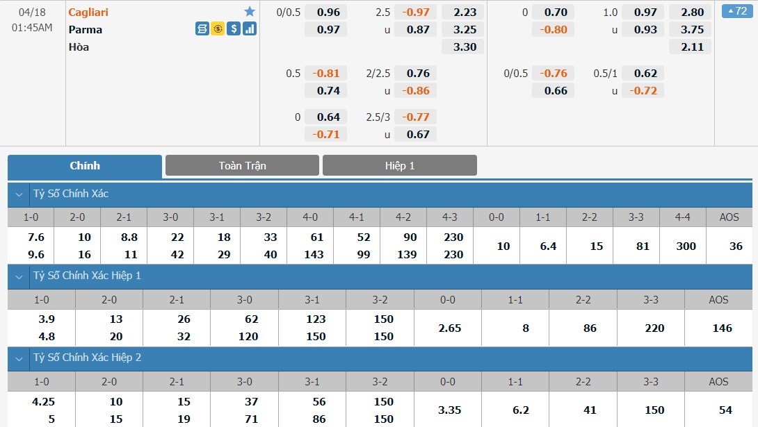 Soi kèo châu Á Cagliari vs Parma